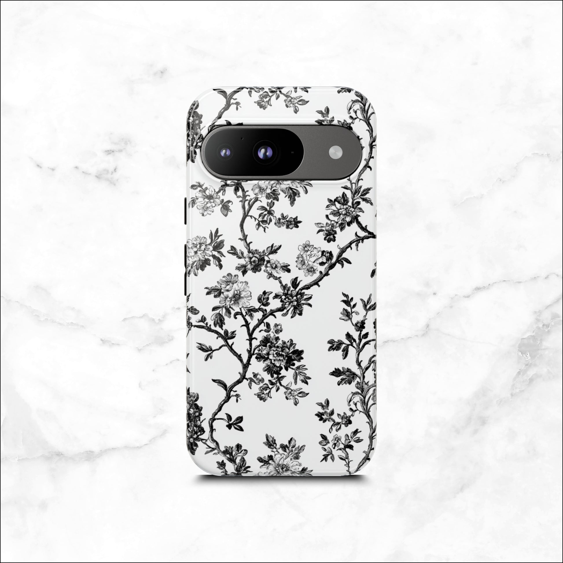 Inspired by French toile style floral patterns, this case features an intricate black botanical illustration on a crisp white background. It offers great protection while keeping your phone looking fashionable and eye catching. Printed in the USA, it comes with free shipping and a 1 year warranty for your peace of mind. (PHONE NOT INCLUDED)