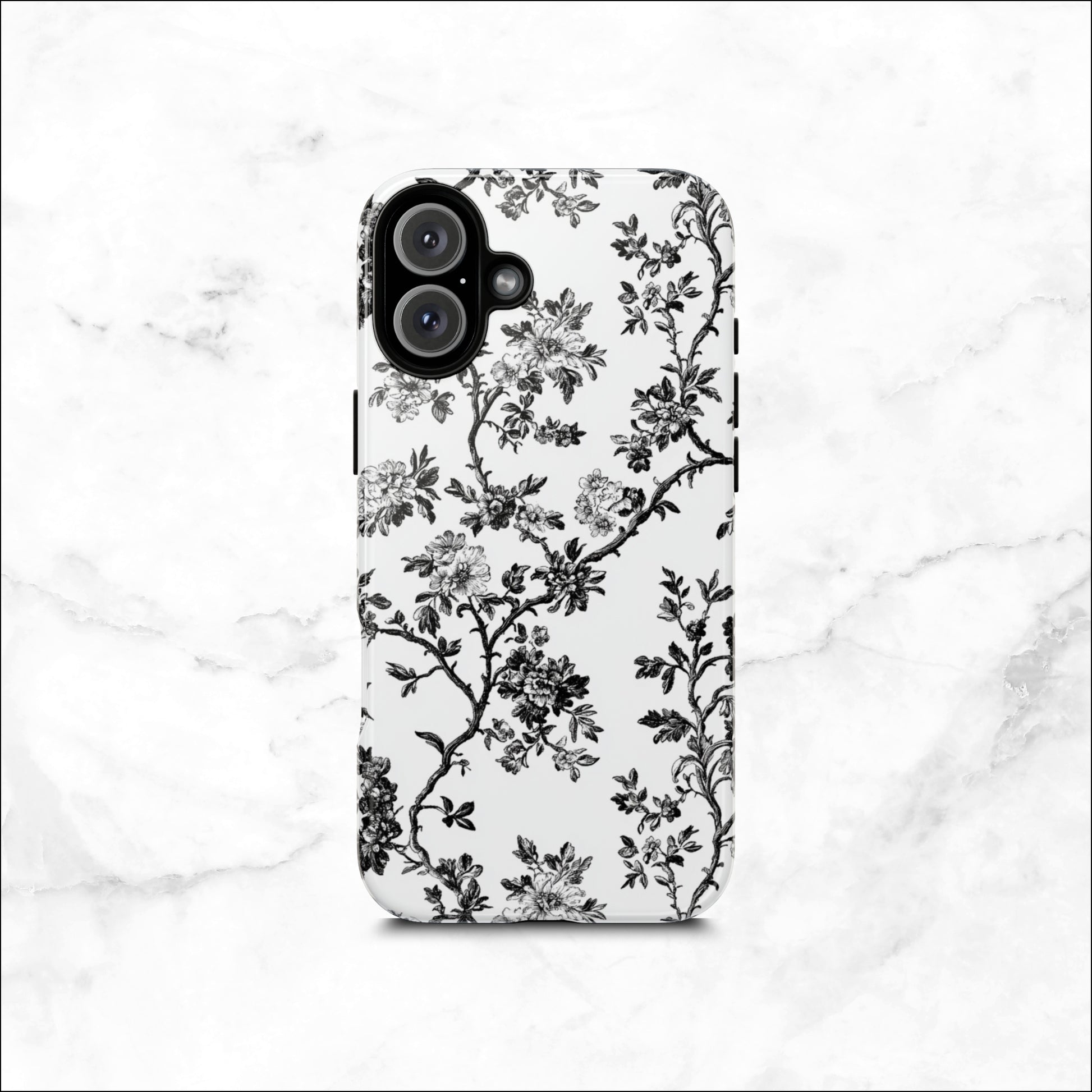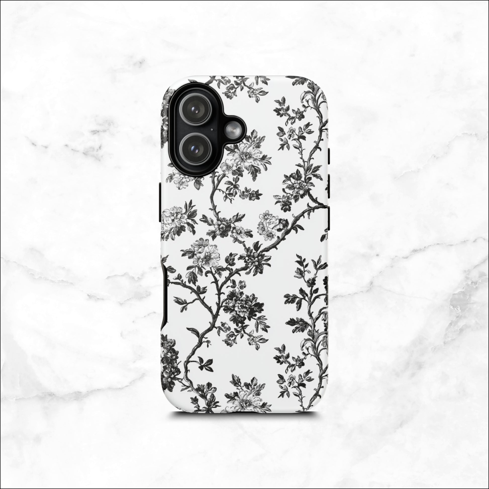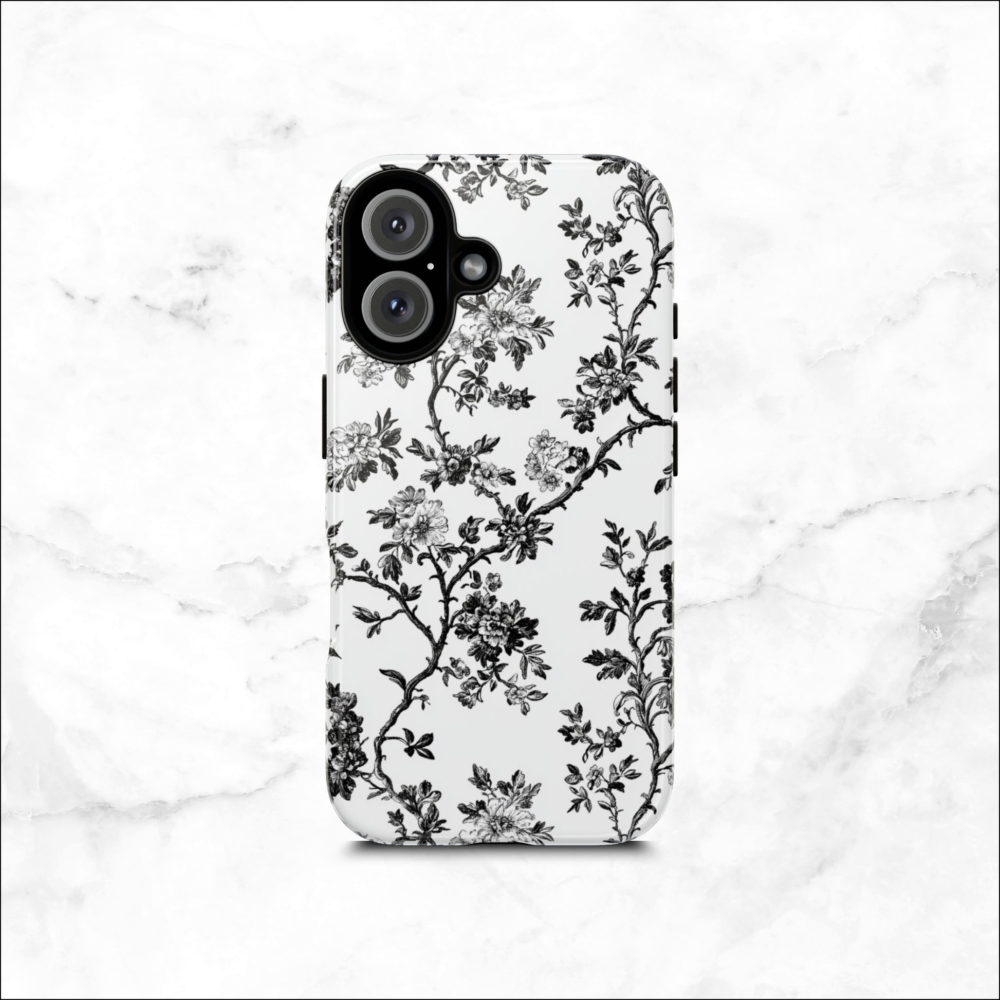 Inspired by French toile style floral patterns, this case features an intricate black botanical illustration on a crisp white background. It offers great protection while keeping your phone looking fashionable and eye catching. Printed in the USA, it comes with free shipping and a 1 year warranty for your peace of mind. (PHONE NOT INCLUDED)