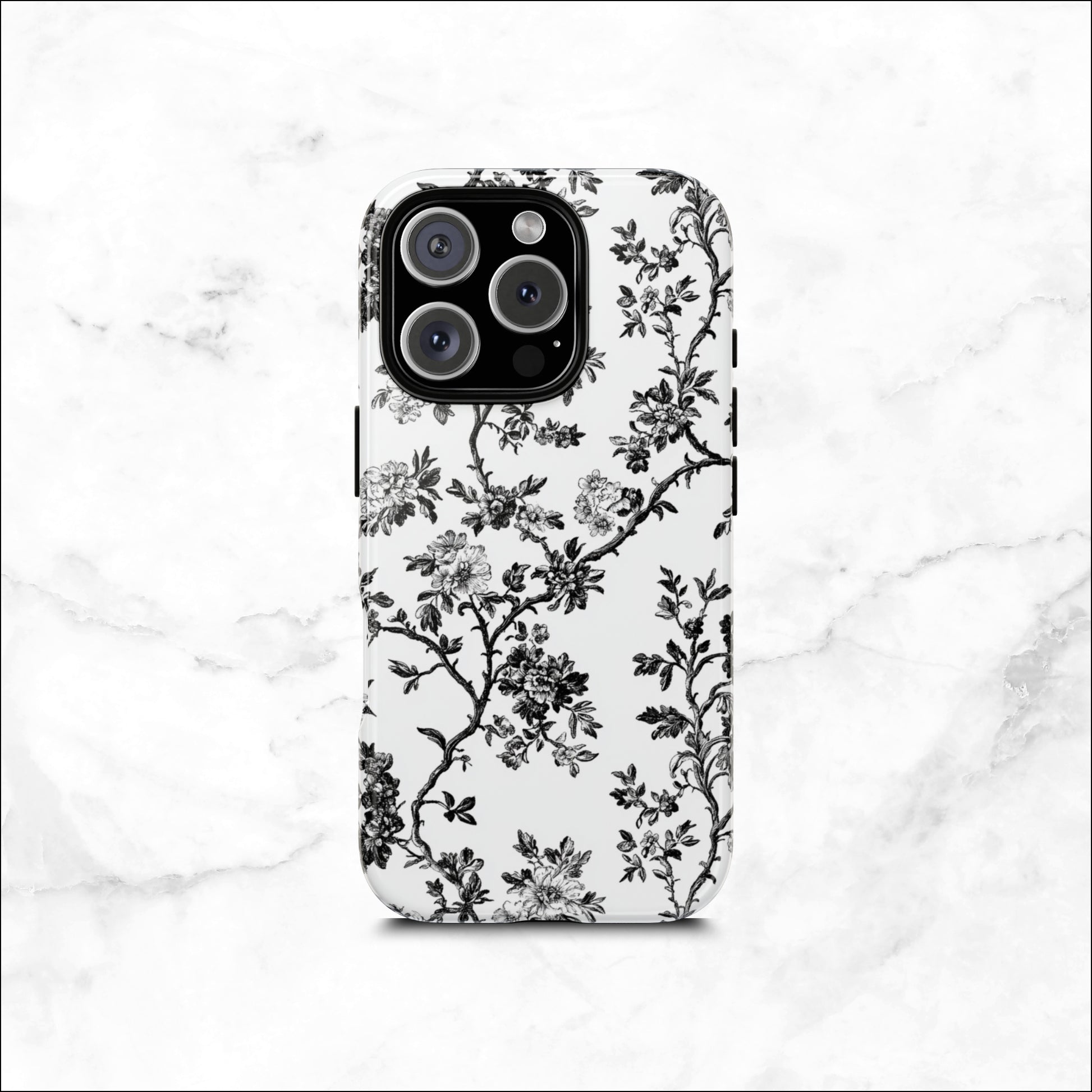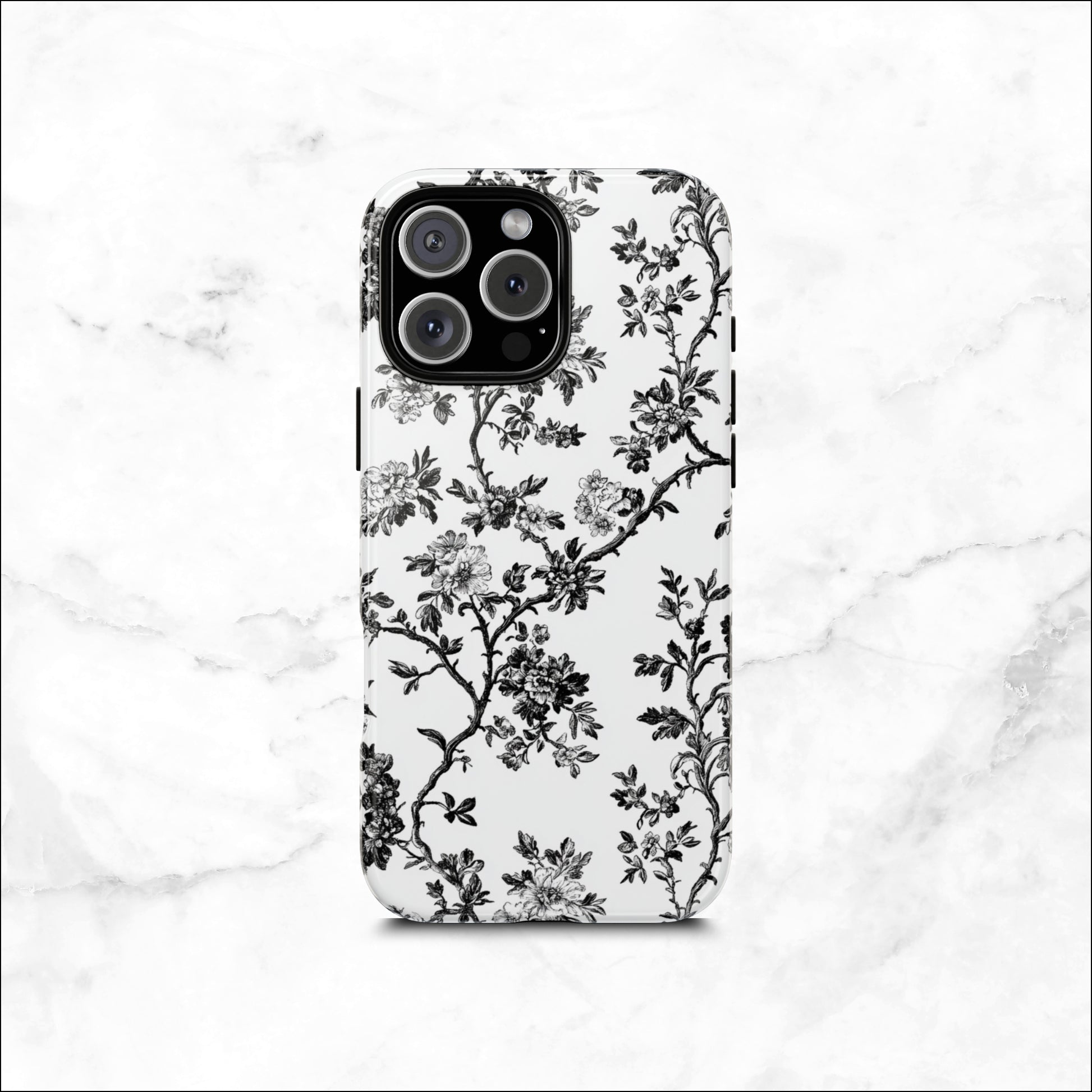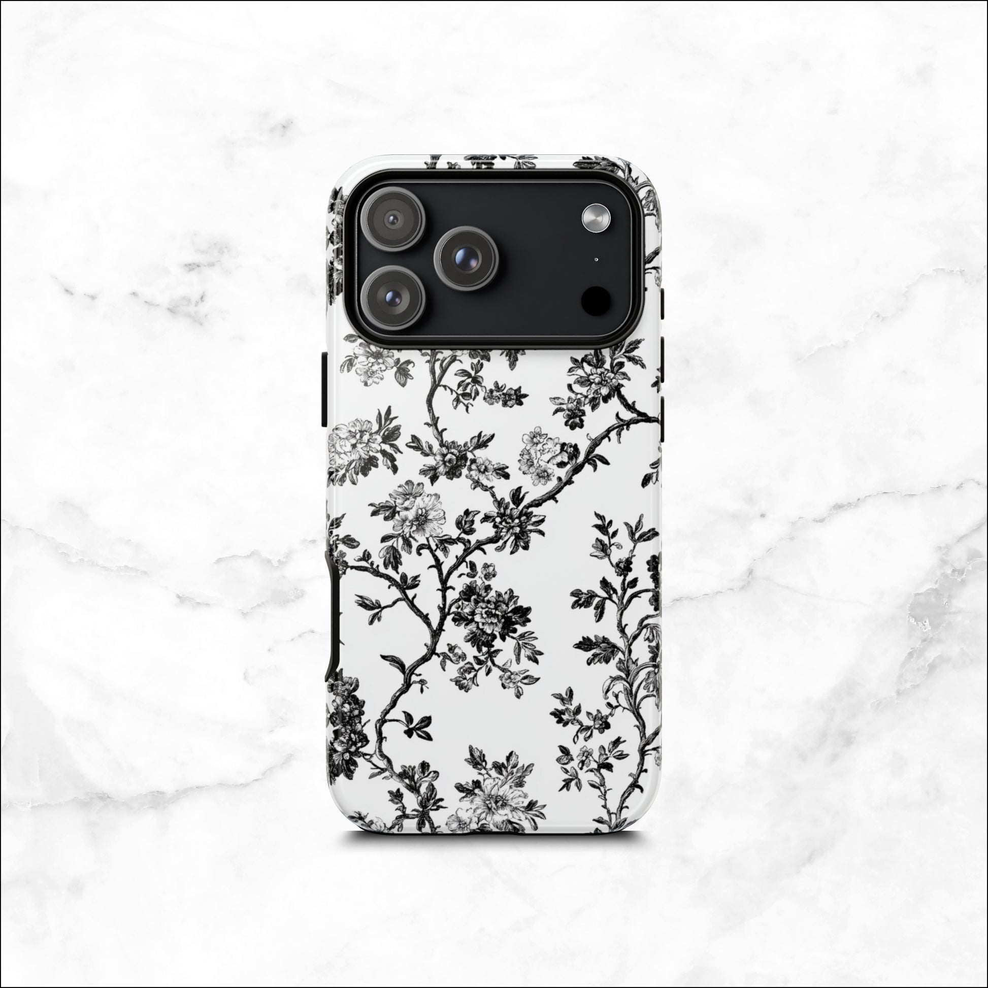 Inspired by French toile style floral patterns, this case features an intricate black botanical illustration on a crisp white background. It offers great protection while keeping your phone looking fashionable and eye catching. Printed in the USA, it comes with free shipping and a 1 year warranty for your peace of mind. (PHONE NOT INCLUDED)