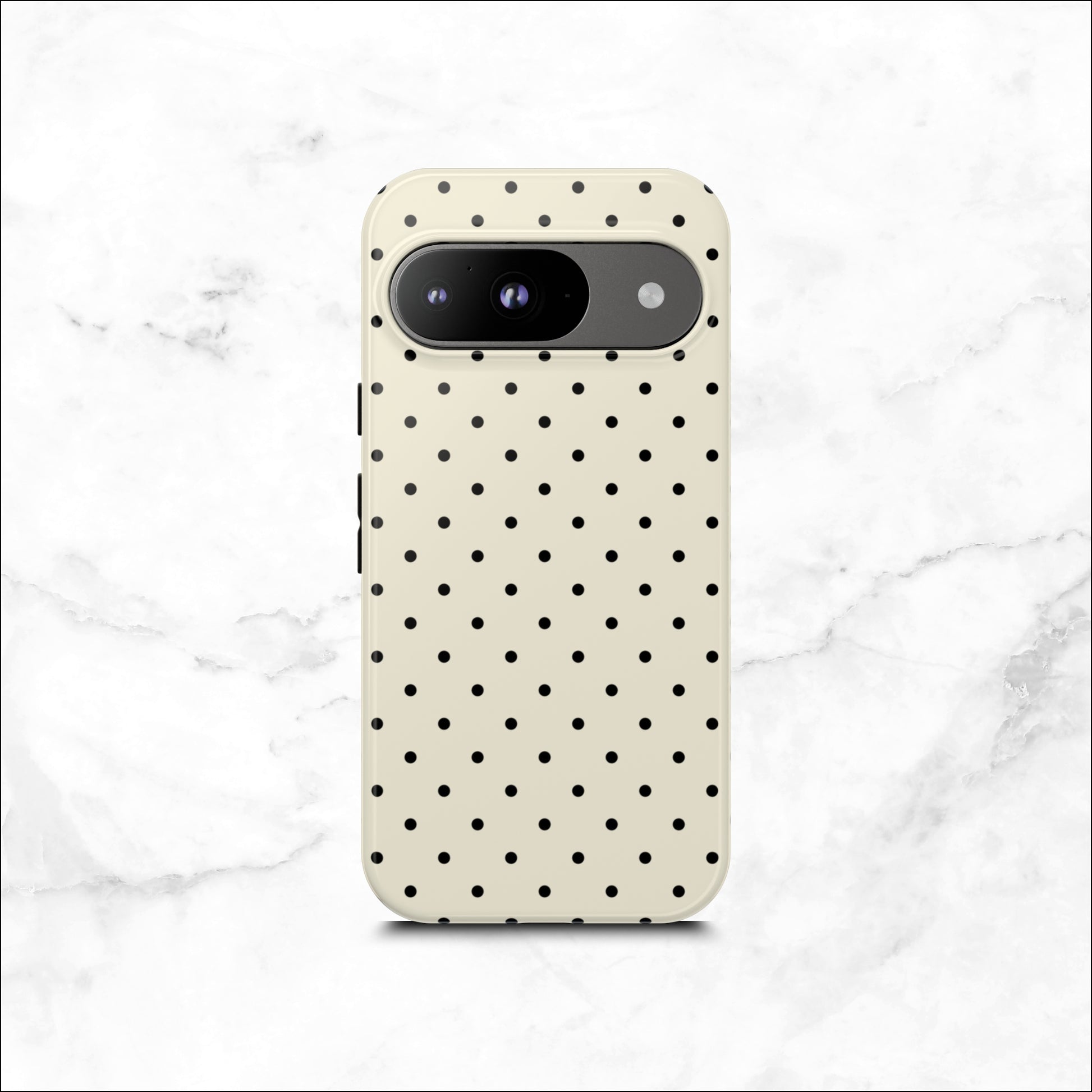 Meet the phone case that balances charm and sophistication with perfect poise. This cream and black polka dot design brings a timeless aesthetic to your everyday tech - effortlessly stylish and endlessly wearable. Whether paired with a tailored blazer or a soft knit, it feels right at home in your curated life. Make room in your rotation because this one's a keeper. It offers great protection while keeping your phone looking fashionable and eye catching. Printed in the USA, it comes with free shipping and a 1 year warranty for your peace of mind. (PHONE NOT INCLUDED)