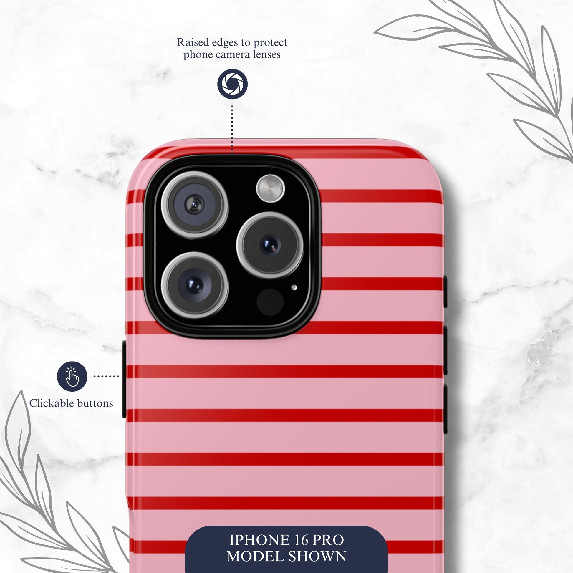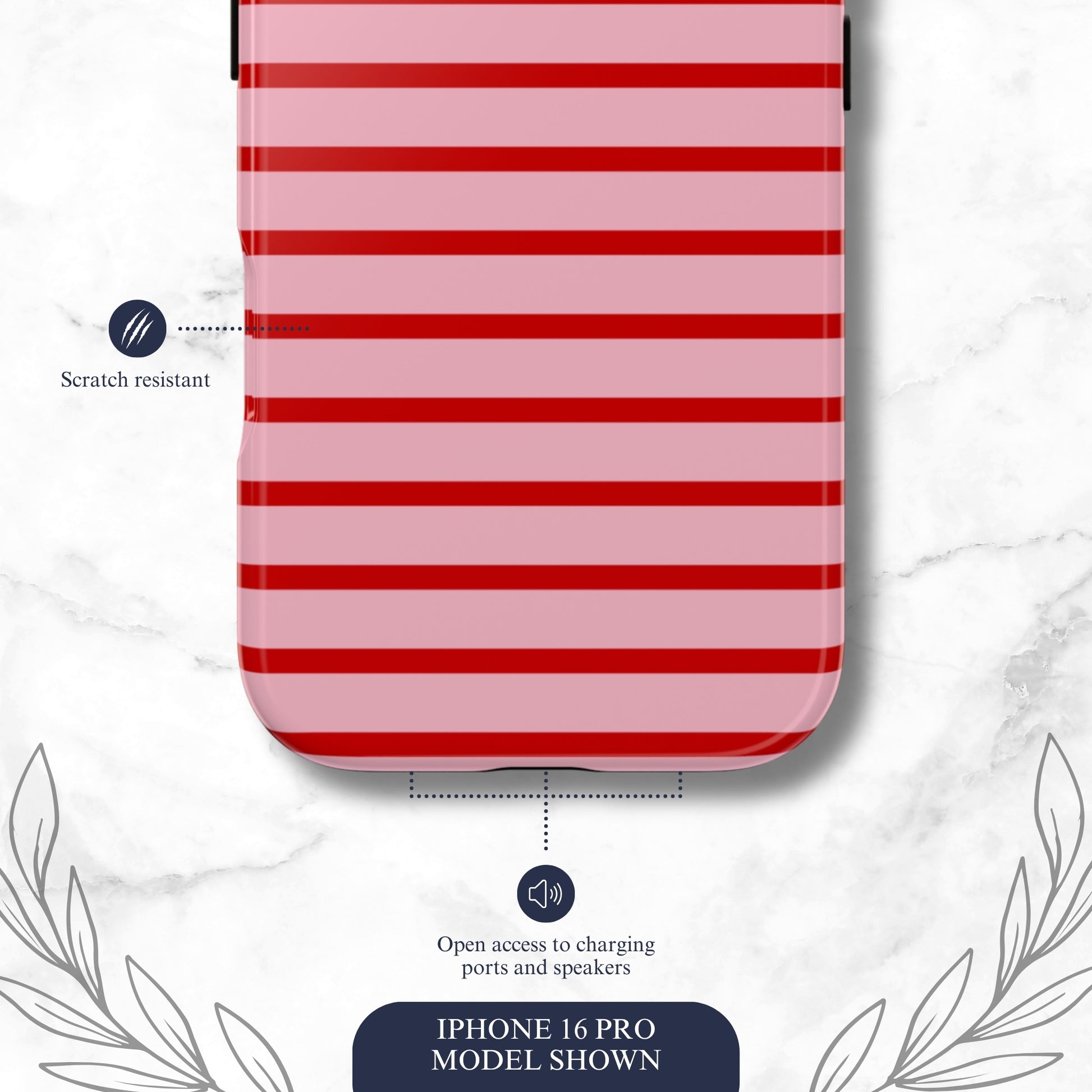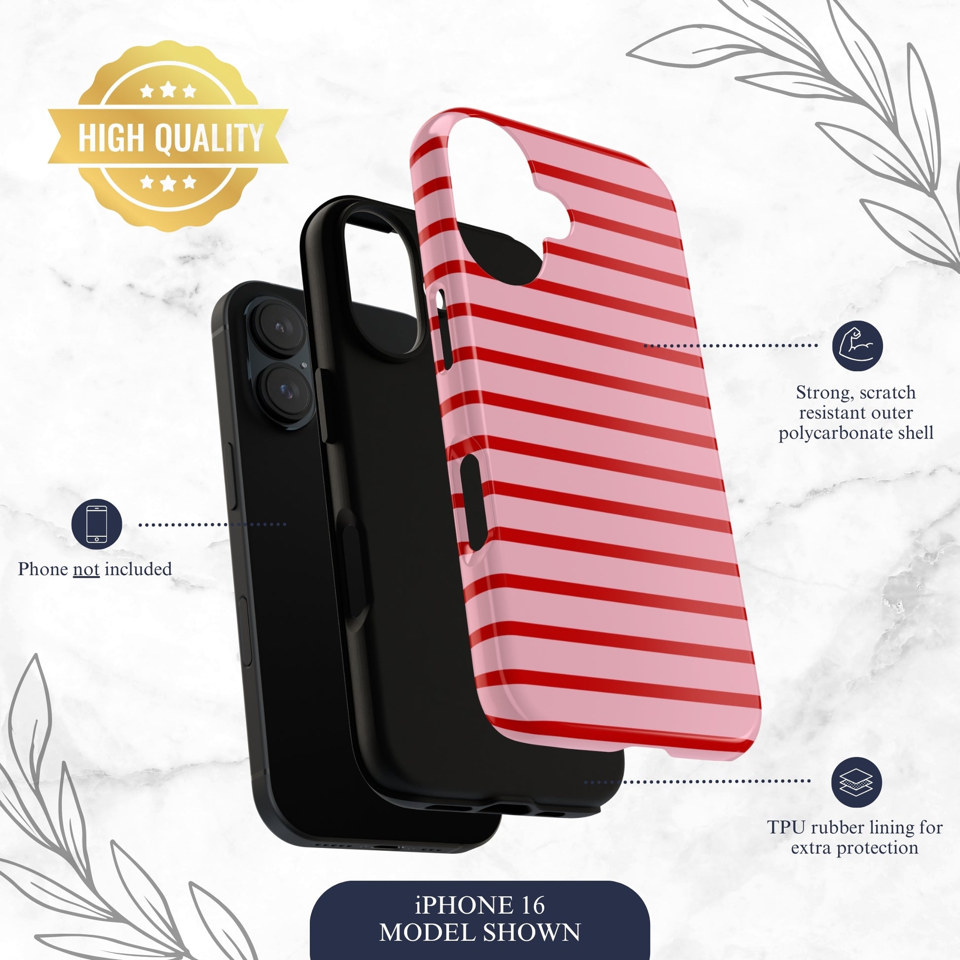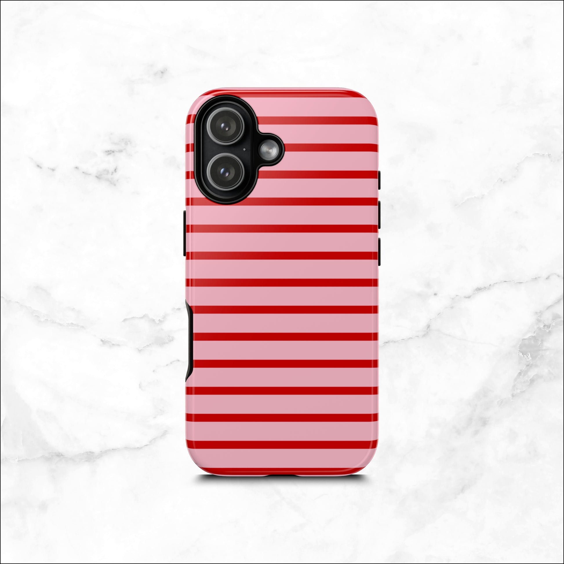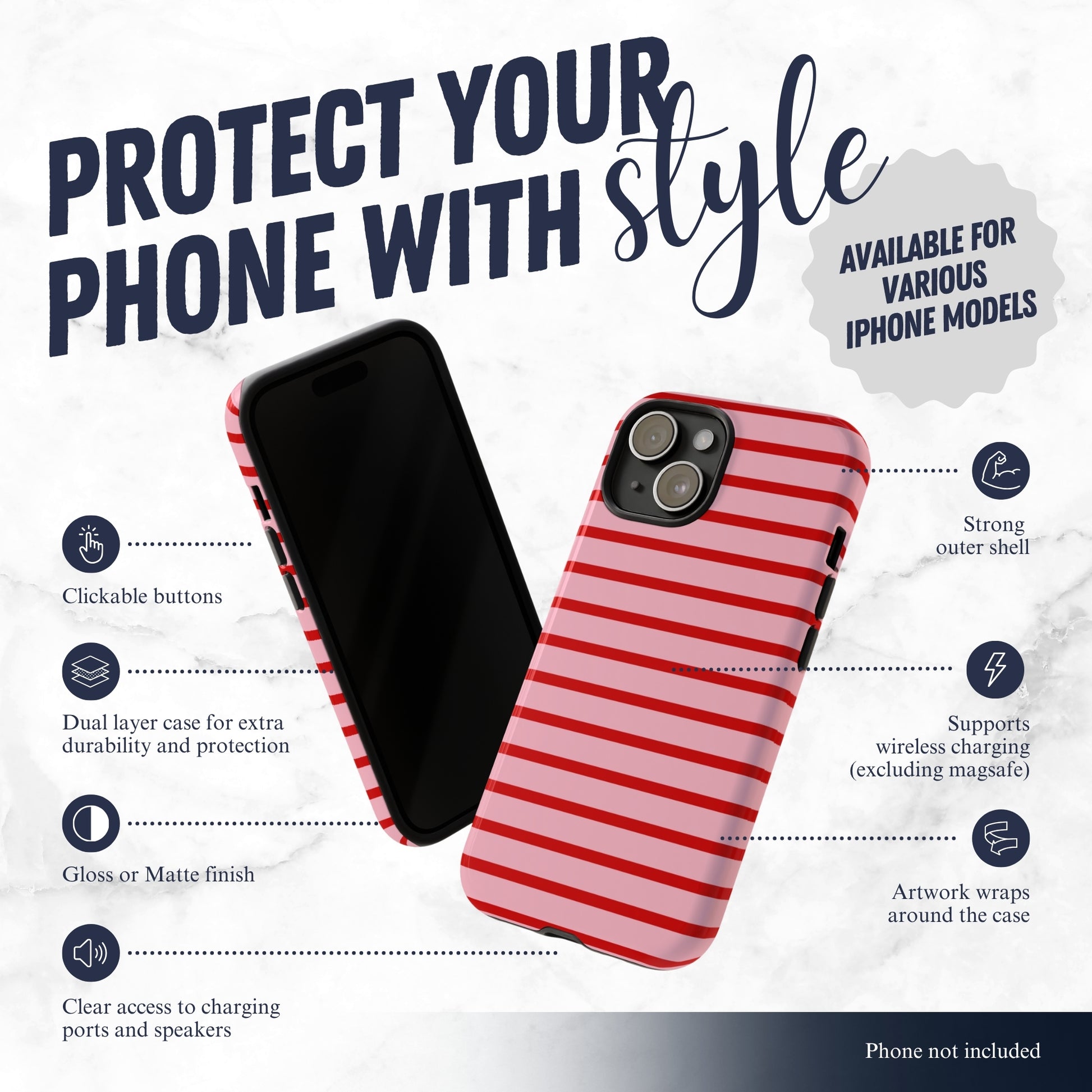 This pink and red striped phone case is bold, sweet, and just the right amount of dramatic - like wearing red lipstick to the grocery store just because. It offers great protection while keeping your phone looking fashionable and eye catching. Printed in the USA, it comes with free shipping and a 1 year warranty for your peace of mind. (PHONE NOT INCLUDED)