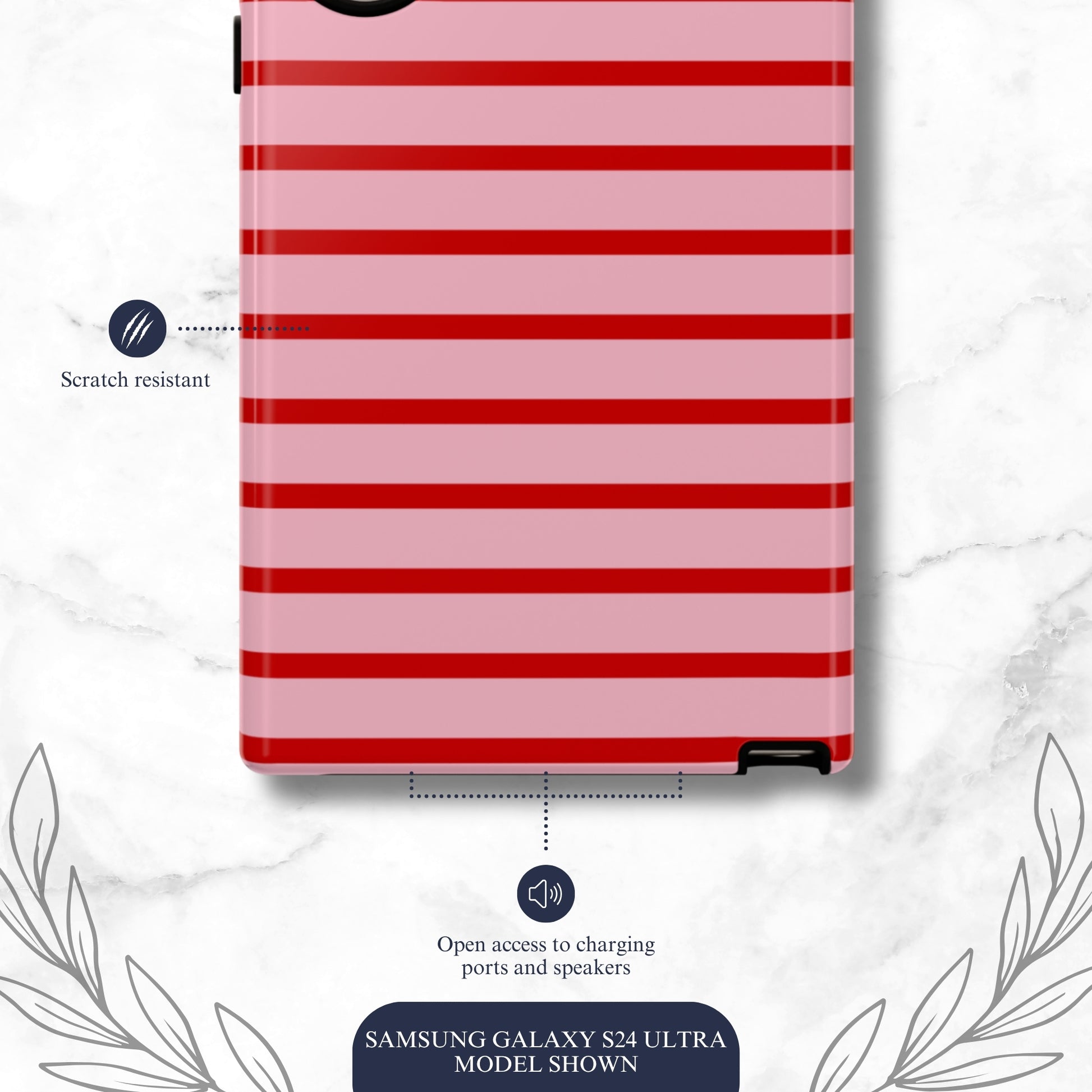 This pink and red striped phone case is bold, sweet, and just the right amount of dramatic - like wearing red lipstick to the grocery store just because. It offers great protection while keeping your phone looking fashionable and eye catching. Printed in the USA, it comes with free shipping and a 1 year warranty for your peace of mind. (PHONE NOT INCLUDED)